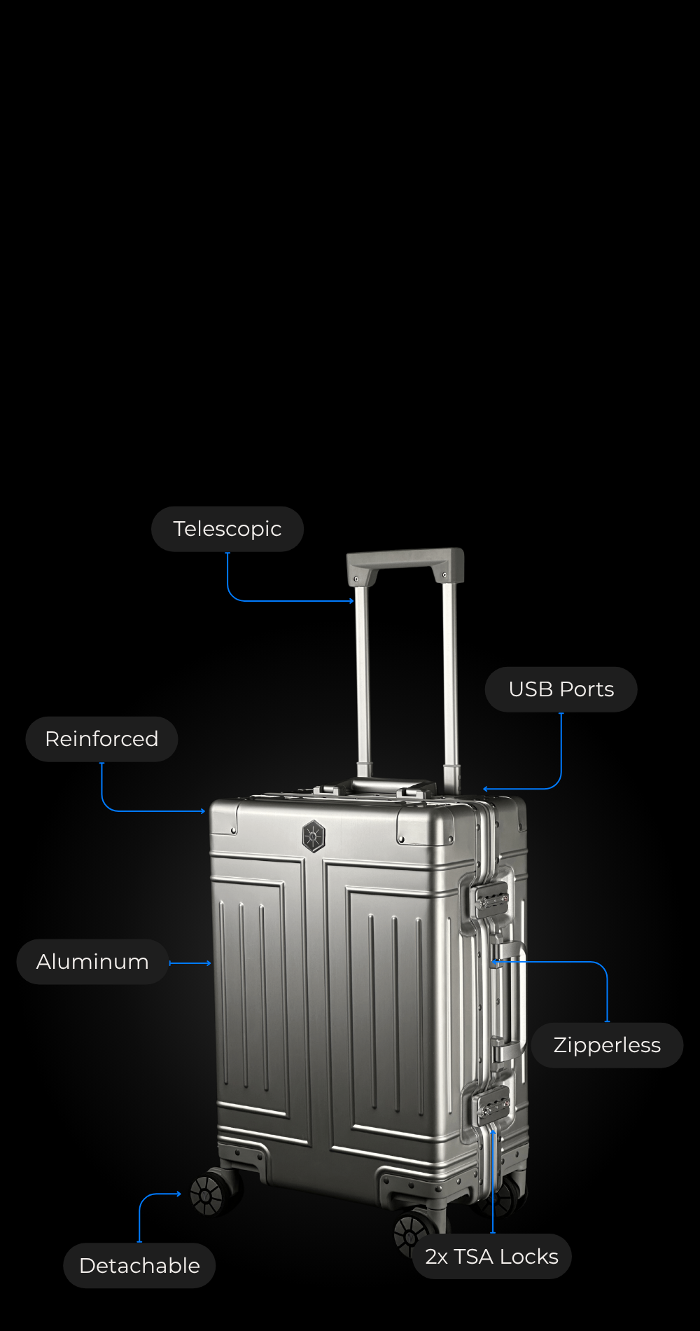 Aluminum shell and 360° wheels handle rough terrain and long hauls.
