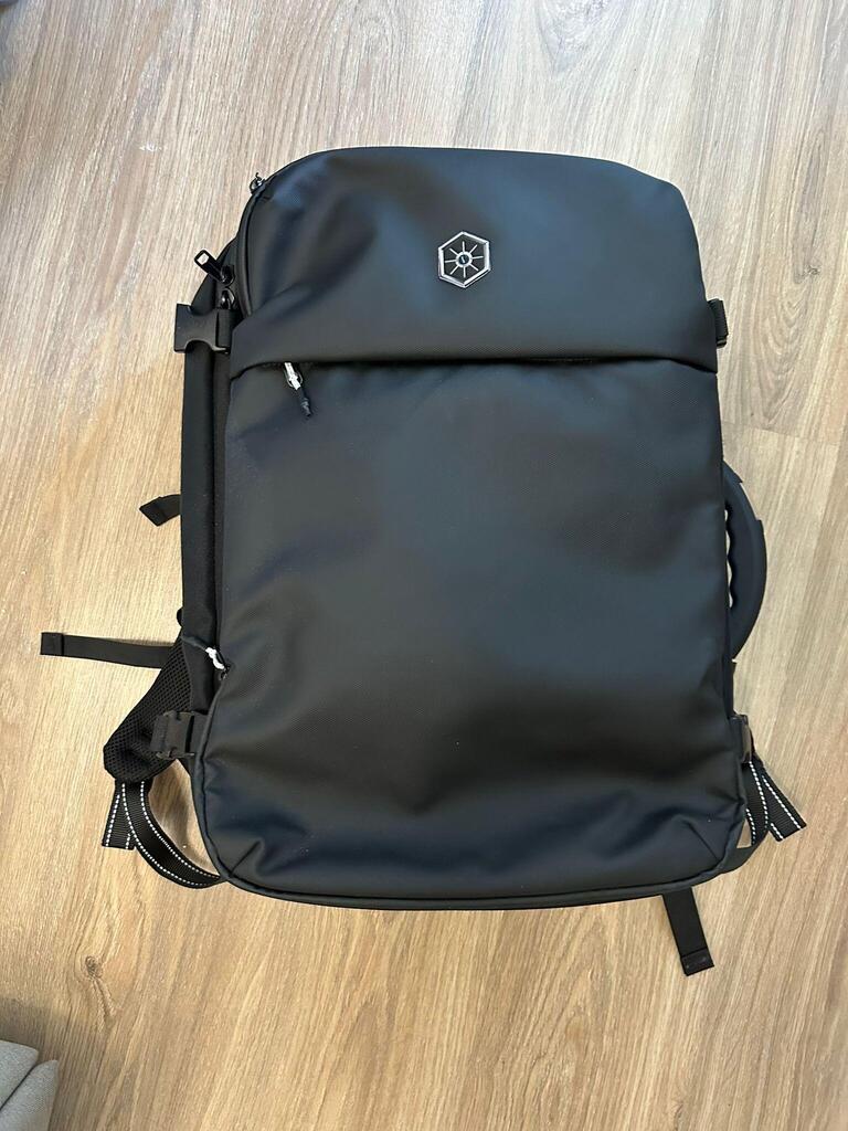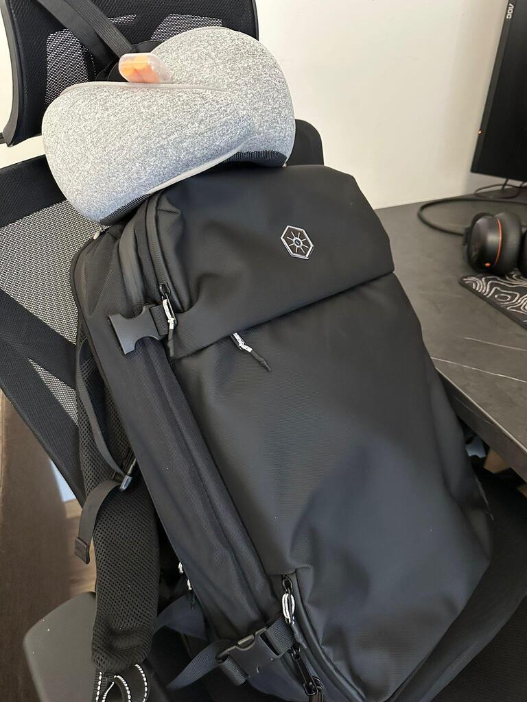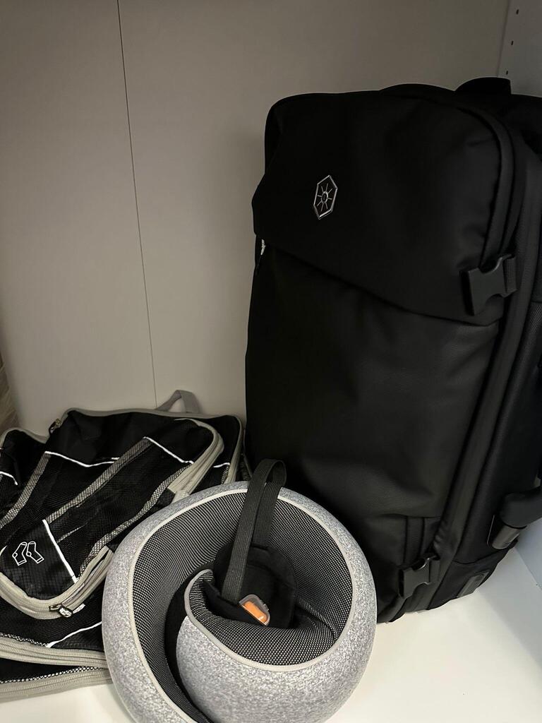 The Nomad is a customizable travel backpack made with water repellent material, with a built-in digital scale in the handle, hidden pockets and expandable storage, built for organization and comfort. This bundle includes the Nomad backpack, a leather toiletry bag, packing bags, and a neck pillow, with multiple color options to fit your style. A modular setup designed for smoother, smarter travel.