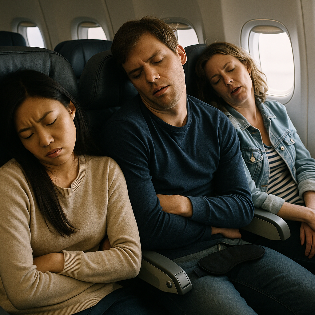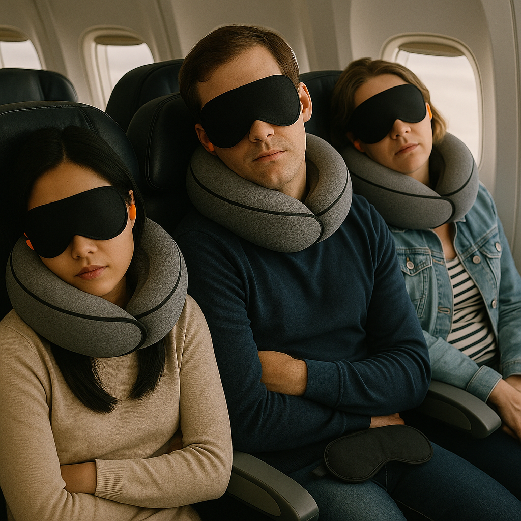 A premium travel sleep set designed for deep rest on long journeys. Includes a wraparound ergonomic neck pillow, blackout eye mask, memory foam earplugs, and a compact carry pouch.